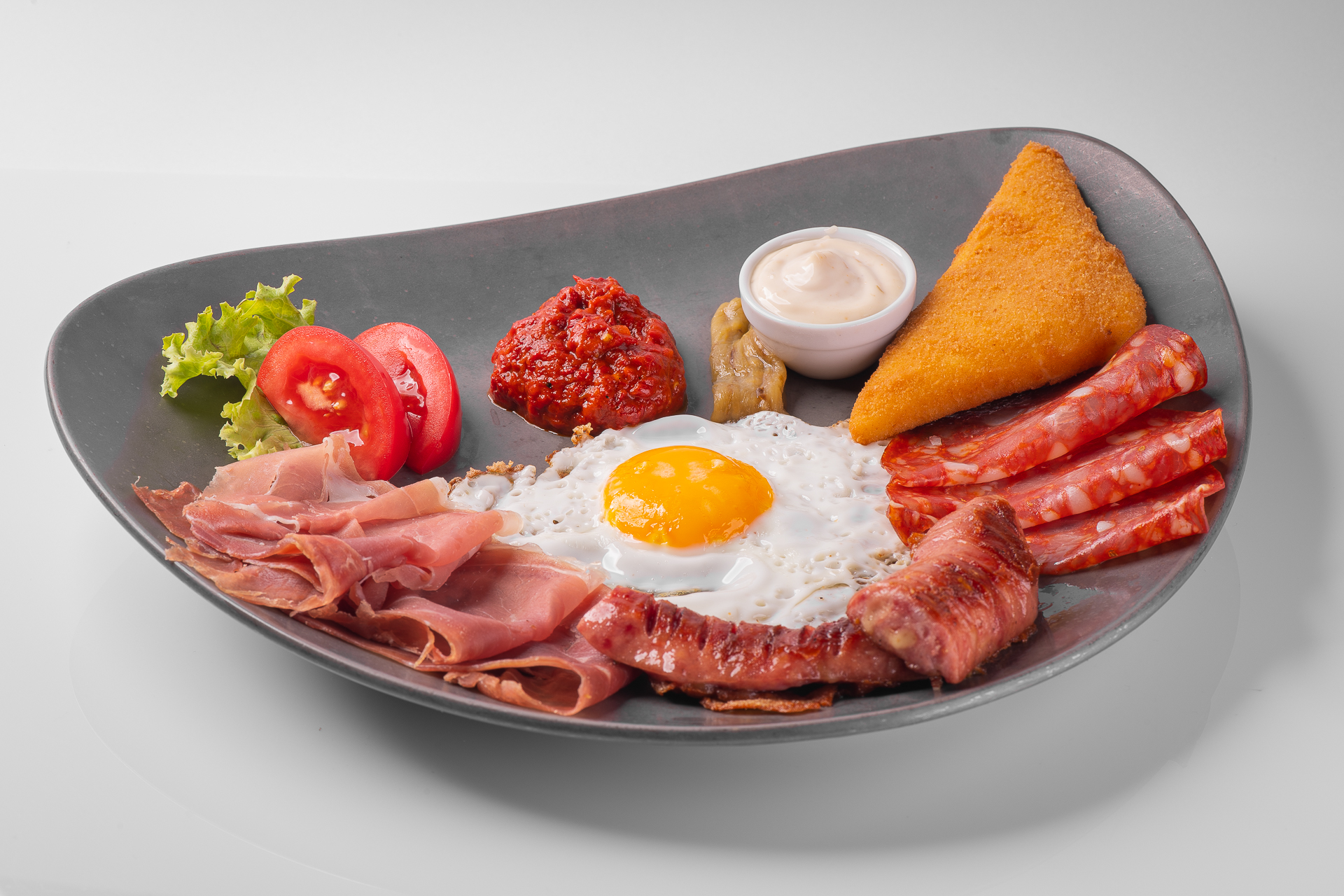 (jaje, svinjski pršut, kulen, kobasica, pohovan kačkavalj, domaći ajvar, paradajz, pečena ljuta paprika)